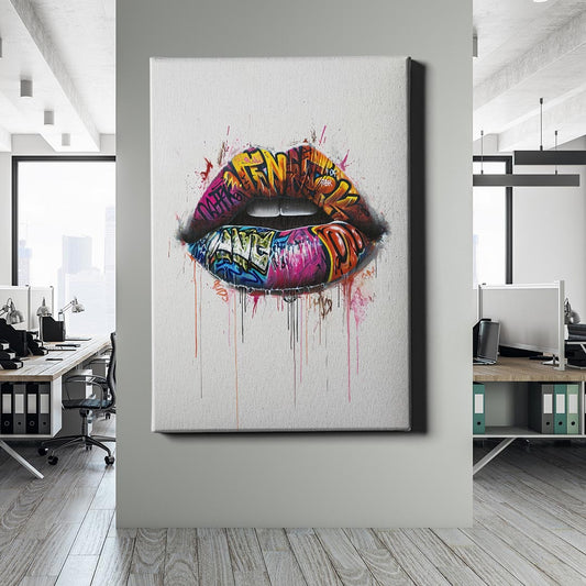 Normaler Preis Von 69,90 €Normaler PreisStückpreis / proVerkaufspreis Von 69,90 €Dieses ausdrucksstarke Kunstwerk zeigt ein Paar Lippen, kunstvoll mit Graffiti-Elementen gestaltet. Die kräftigen Farben und die tropfenden Farbverläufe verleihen dem Bild eine urbane, rebellische Ästhetik. Perfekt für Liebhaber von Street Art und moderner Pop Art, die ihrem Raum einen kreativen, trendigen Touch verleihen möchten.
