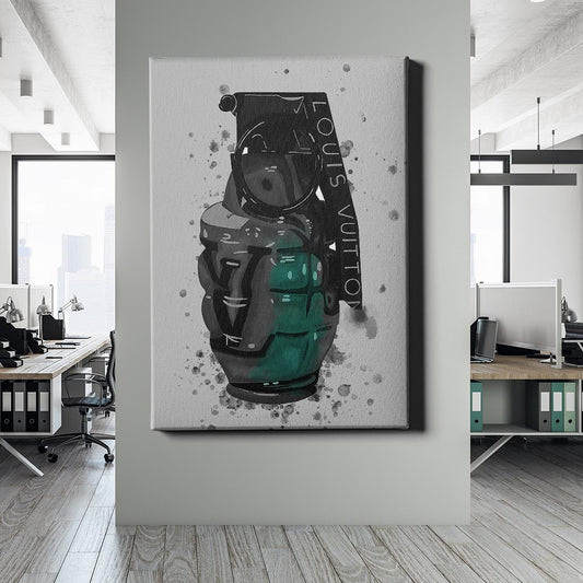 Normaler Preis Von 69,90 €Normaler PreisStückpreis / proVerkaufspreis Von 69,90 €Dieses provokante Kunstwerk vereint Luxus und Gefahr in einer stilisierten Darstellung einer Granate mit dem Branding von Louis Vuitton. Die minimalistische Farbpalette und die gesprenkelten Farbtropfen verleihen dem Bild einen modernen, rebellischen Charakter. Perfekt für alle, die auffällige Statement-Kunst mit einer tiefgründigen Botschaft lieben.