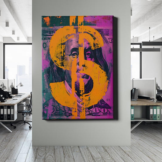 Normaler Preis Von 69,90 €Normaler PreisStückpreis / proVerkaufspreis Von 69,90 €Dieses kraftvolle Kunstwerk kombiniert das ikonische Porträt von Benjamin Franklin mit einem übergroßen Dollarzeichen in leuchtendem Orange. Die Mischung aus Pop Art und Street Art verleiht dem Bild eine moderne, urbane Ästhetik, die Reichtum und Macht symbolisiert. Ein perfektes Statement-Piece für Liebhaber von Luxus, Erfolg und Kunst mit Bedeutung.