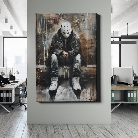 Normaler Preis Von 69,90 €Normaler PreisStückpreis / proVerkaufspreis Von 69,90 €Dieses düstere Kunstwerk zeigt eine Jason Voorhees mit seiner ikonischen weißen Maske, die auf einer Bank sitzt, die Hände blutig, in Gedanken versunken. Der dramatische Hintergrund mit dunklen Farbverläufen und Spritzern verstärkt die Atmosphäre von Unheil und Geheimnis. Ein faszinierendes Statement für Liebhaber urbaner Street-Art und mystischer Charaktere.