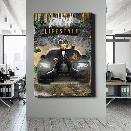 Normaler Preis Von 69,90 €Normaler PreisStückpreis / proVerkaufspreis Von 69,90 €Dieses kunstvolle Street-Art-Design zeigt eine ikonische Figur im Anzug, lässig auf einem luxuriösen Rolls-Royce sitzend, umgeben von Geldscheinen und goldenen Elementen. Die Kombination aus urbaner Ästhetik und Symbolen für Erfolg und Reichtum macht dieses Bild zu einem echten Statement für alle, die groß träumen und hart arbeiten. Perfekt für Unternehmer, Visionäre und Fans des High-Class-Lifestyles.