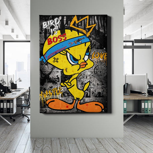 Normaler Preis Von 69,90 €Normaler PreisStückpreis / proVerkaufspreis Von 69,90 €Dieses kraftvolle Street-Art-Kunstwerk zeigt Tweety in einer ganz neuen, rebellischen Version. Mit Bandana, Graffiti-Elementen und dem Spruch „Bird is Boss“ verkörpert es Hustle, Attitude und urbanen Style. Der schwarz-weiße Comic-Hintergrund bildet einen starken Kontrast zur knalligen Farbgebung von Tweety, was dieses Bild zu einem echten Blickfang macht. Perfekt für alle, die Kunst mit Charakter und Message lieben.
