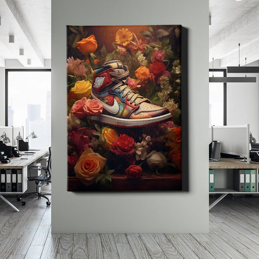 Normaler Preis Von 69,90 €Normaler PreisStückpreis / proVerkaufspreis Von 69,90 €Ein ikonischer Nike Air Jordan 1, kunstvoll inszeniert inmitten einer prachtvollen Blumenlandschaft. Dieses Bild vereint Streetwear-Kultur mit floraler Eleganz und schafft eine harmonische Balance zwischen urbanem Stil und natürlicher Schönheit. Ein Symbol für Individualität, Kreativität und die Verbindung von Mode mit Kunst.