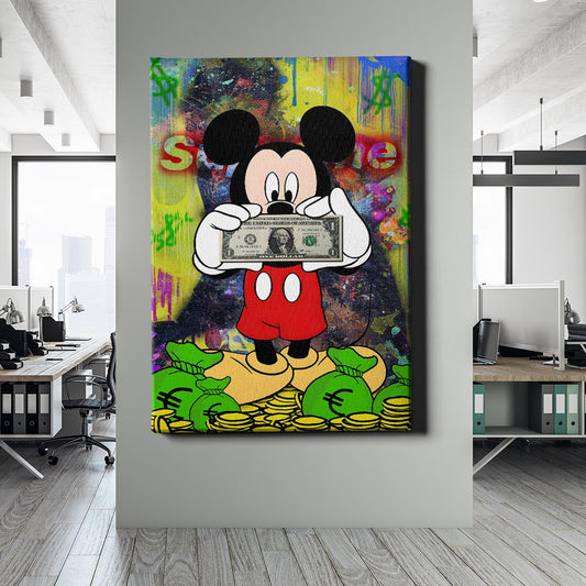 Normaler Preis Von 69,90 €Normaler PreisStückpreis / proVerkaufspreis Von 69,90 €Mickey Mouse thront auf einem Berg aus Reichtum und hält einen Dollar in den Händen – ein spielerischer Kommentar zur Macht des Geldes. Die farbenfrohe Street-Art-Kulisse mit Graffiti-Elementen verbindet Popkultur mit Kapitalismus-Kritik und verleiht dem Bild eine moderne, urbane Ausstrahlung.