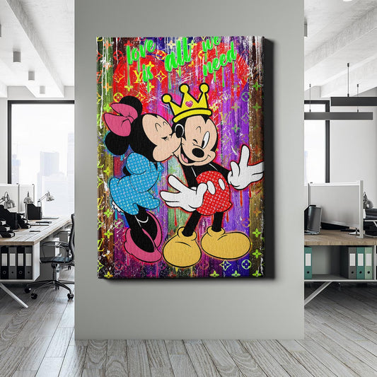 Normaler Preis Von 69,90 €Normaler PreisStückpreis / proVerkaufspreis Von 69,90 €Minnie schenkt Mickey einen Kuss, während er mit einer Krone auf dem Kopf den Moment genießt. Ein farbenfrohes Street-Art-Werk, das Liebe, Zuneigung und Luxus in einer modernen Interpretation vereint.