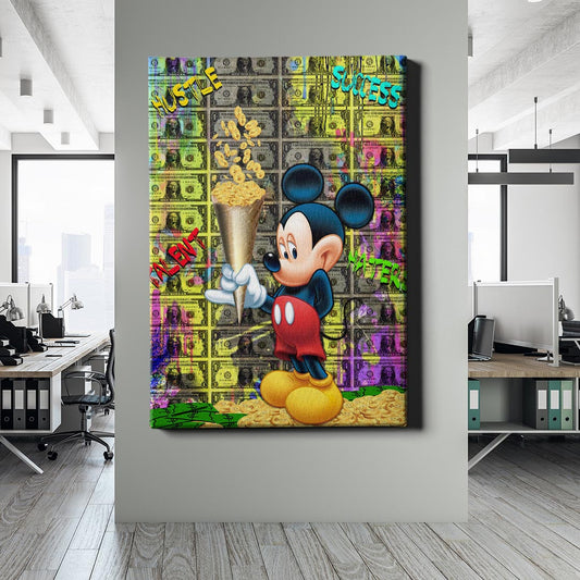 Normaler Preis Von 69,90 €Normaler PreisStückpreis / proVerkaufspreis Von 69,90 €Mickey Mouse hält ein goldenes Eishörnchen, aus dem Münzen regnen – eine humorvolle Darstellung von Erfolg und Reichtum. Die mit Dollarnoten überzogene Kulisse betont den Wert von Hustle, Talent und Zielstrebigkeit. Ein farbenfrohes Statement für alle, die an ihre Träume glauben.