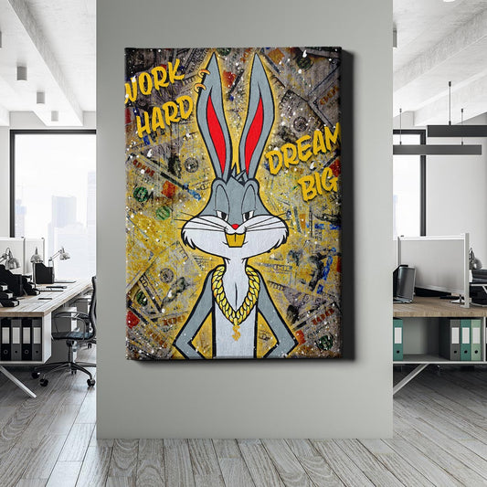 Normaler Preis Von 69,90 €Normaler PreisStückpreis / proVerkaufspreis Von 69,90 €Bugs Bunny zeigt sich im Street-Style mit Goldkette und Diamantgrill vor einem Hintergrund aus Geldscheinen. Die kräftigen Farben und der selbstbewusste Ausdruck vermitteln den Spirit von Erfolg, Reichtum und harter Arbeit.