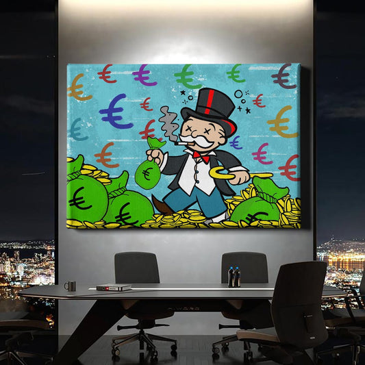Normaler Preis Von 69,90 €Normaler PreisStückpreis / proVerkaufspreis Von 69,90 €Ein fröhlicher Cartoon-Millionär steht umgeben von goldenen Münzen und prall gefüllten Geldsäcken mit Euro-Symbolen (€). Im Hintergrund leuchten bunte Euro-Zeichen auf einer lebhaften, texturierten blauen Fläche. Die Szene strahlt Reichtum, Glück und finanziellen Erfolg aus – mit einem Hauch von Humor und Spaß.