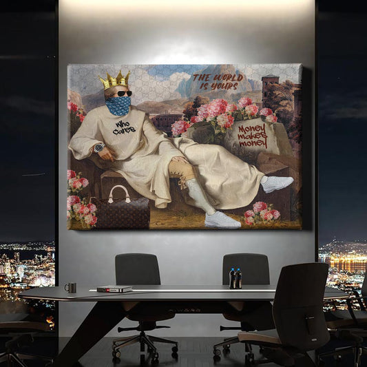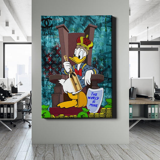 Normaler Preis Von 69,90 €Normaler PreisStückpreis / proVerkaufspreis Von 69,90 €Donald Duck als unangefochtener Herrscher über Reichtum und Luxus. Gekleidet in ein elegantes Louis Vuitton-Outfit, mit einer Krone auf dem Kopf und einer edlen Flasche Champagner in der Hand, sitzt er auf seinem Thron, umgeben von Goldmünzen und Geldsäcken. Das kunstvolle Street-Art-Design kombiniert Mode, Wohlstand und Macht in einem einzigartigen Bild.