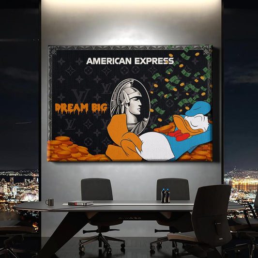 Normaler Preis Von 69,90 €Normaler PreisStückpreis / proVerkaufspreis Von 69,90 €Donald Duck im Luxusrausch! Umgeben von herabfallenden Dollarscheinen, prall gefüllten Geldsäcken und edlen Designer-Elementen wie Gucci, Prada und Louis Vuitton, zelebriert er den ultimativen Reichtum. Die knalligen Farben und das wilde Street-Art-Design verleihen diesem Kunstwerk eine energiegeladene, extravagante Ausstrahlung – perfekt für alle, die von Erfolg, Luxus und finanzieller Freiheit träumen.