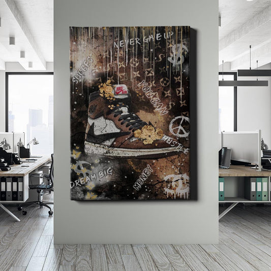 Normaler Preis Von 69,90 €Normaler PreisStückpreis / proVerkaufspreis Von 69,90 €Ein ikonischer Sneaker, veredelt mit goldenen Akzenten und luxuriösen Details. Die Kombination aus Nike Air Jordan, Louis Vuitton und Chanel erschafft ein Kunstwerk, das Streetwear mit High-Fashion vereint. Umgeben von inspirierenden Botschaften wie "Never Give Up" und "Dream Big", symbolisiert dieses Bild den unermüdlichen Hustle auf dem Weg zum Erfolg.