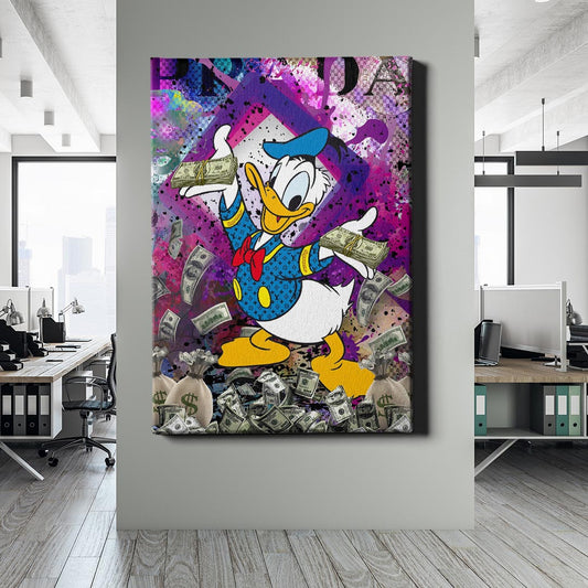 Normaler Preis Von 69,90 €Normaler PreisStückpreis / proVerkaufspreis Von 69,90 €Donald Duck entspannt auf einem Berg aus Goldmünzen, während die motivierende Botschaft „If you want to be rich, never give up“ die Szene dominiert. Das farbenfrohe Street-Art-Design mit urbanen Graffiti-Elementen unterstreicht den rebellischen und entschlossenen Geist des Erfolgsstrebenden. Ein perfektes Kunstwerk für alle, die sich vom Weg zum Wohlstand nicht abbringen lassen.