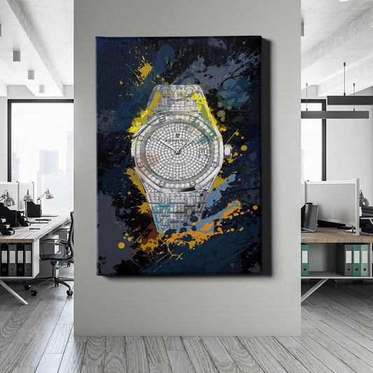 Normaler Preis Von 69,90 €Normaler PreisStückpreis / proVerkaufspreis Von 69,90 €Ein kunstvolles Leinwandbild einer luxuriösen Audemars Piguet Royal Oak, verziert mit funkelnden Diamanten. Die kontrastreiche, abstrakte Farbgestaltung mit dunklen und goldenen Akzenten hebt die Uhr als Symbol für Eleganz und Exklusivität hervor.