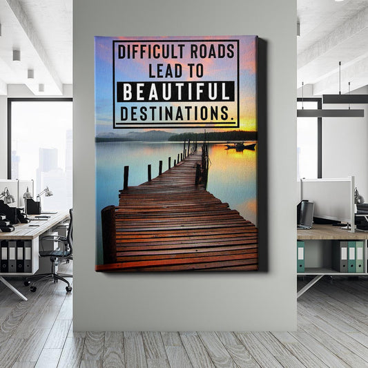 Normaler Preis Von 69,90 €Normaler PreisStückpreis / proVerkaufspreis Von 69,90 €Ein malerischer Holzsteg führt ins ruhige Wasser eines Sees, während der Himmel in warmen Sonnenuntergangstönen leuchtet. Der motivierende Spruch erinnert daran, dass schwierige Wege oft zu den schönsten Zielen führen. Eine harmonische Kombination aus Natur und Inspiration.