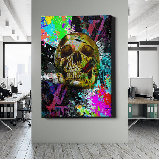 Normaler Preis Von 69,90 €Normaler PreisStückpreis / proVerkaufspreis Von 69,90 €Ein goldener Schädel thront im Zentrum eines farbenfrohen, chaotischen Hintergrunds voller luxuriöser Elemente. Das Bild symbolisiert die Vergänglichkeit von Reichtum und Status – ein kraftvolles Statement über Luxus, Konsum und die unausweichliche Realität des Lebens. Die Mischung aus Street-Art, Graffiti und High-Fashion-Ästhetik macht dieses Kunstwerk zu einer explosiven Darstellung von Macht und Vergänglichkeit.