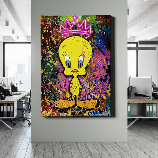 Normaler Preis Von 69,90 €Normaler PreisStückpreis / proVerkaufspreis Von 69,90 €Ein farbenfrohes Street-Art-Meisterwerk, das Nostalgie und Luxus kombiniert. Tweety steht im Mittelpunkt, umgeben von energiegeladenen Farbspritzern und goldenen Akzenten. Die leuchtende Neonkrone verleiht ihm eine königliche Aura – ein Symbol für Selbstbewusstsein und Style.