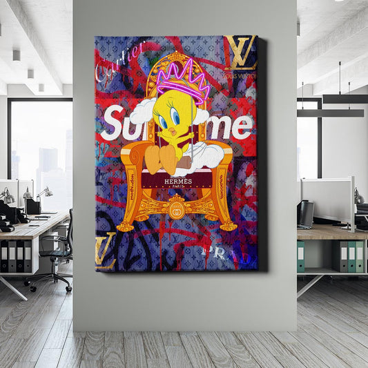 Normaler Preis Von 69,90 €Normaler PreisStückpreis / proVerkaufspreis Von 69,90 €Tweety regiert die Welt des Luxus in diesem eindrucksvollen Street-Art-Design. Auf einem prächtigen Thron sitzend, mit einer leuchtenden Neonkrone verziert, verkörpert er eine freche Mischung aus Nostalgie und High-Fashion. Der Hintergrund ist gespickt mit exklusiven Markenelementen, die das Bild zu einem echten Statement-Piece machen.