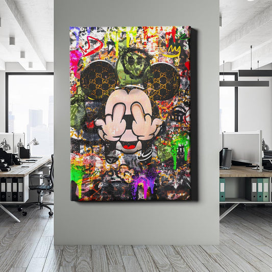Normaler Preis Von 69,90 €Normaler PreisStückpreis / proVerkaufspreis Von 69,90 €Dieses auffällige Kunstwerk zeigt eine rebellische Version von Mickey Mouse inmitten eines lebhaften Graffiti-Hintergrunds. Mit Gucci-Elementen und einem provokanten Gestus kombiniert es Luxus mit urbaner Street Art und schafft ein einzigartiges Statement-Piece. Perfekt für moderne Interiors mit einem Hauch von Extravaganz.
