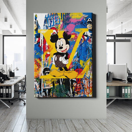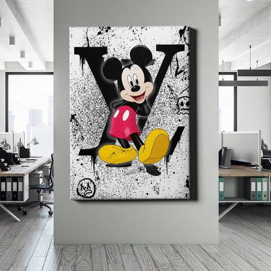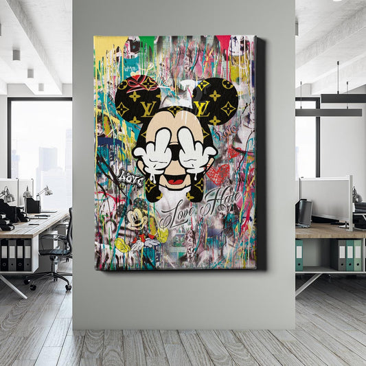 Normaler Preis Von 69,90 €Normaler PreisStückpreis / proVerkaufspreis Von 69,90 €Dieses Street-Art-Meisterwerk kombiniert Luxusmarken mit urbaner Rebellion. Mickey Mouse trägt ein Louis Vuitton-inspiriertes Design, während er mit beiden Händen eine provokante Geste zeigt. Der Hintergrund aus Graffiti, Pop-Art-Elementen und Liebes- & Hass-Symbolen verstärkt die Kollision zwischen High Fashion und Street Culture.
