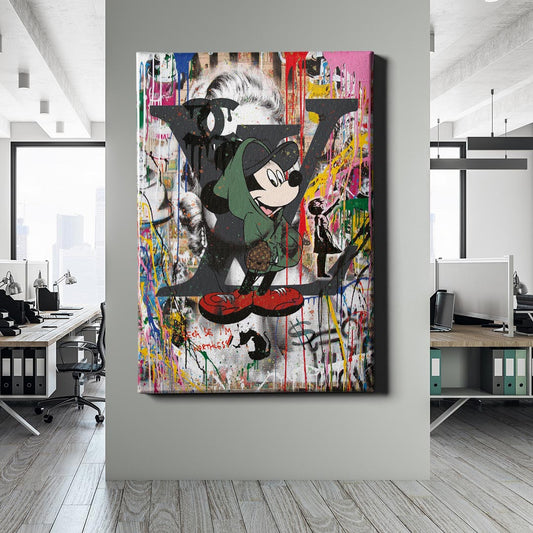 Normaler Preis Von 69,90 €Normaler PreisStückpreis / proVerkaufspreis Von 69,90 €Ein einzigartiges Street-Art-Meisterwerk, das Mickey Mouse in einem völlig neuen Licht zeigt. Gekleidet in einen grünen Hoodie mit Louis Vuitton-Tasche, verkörpert Mickey hier die moderne Urban Culture. Der knallige Hintergrund aus Graffiti, Chanel-Logos, Marilyn Monroe und Banksy-inspirierten Elementen macht dieses Kunstwerk zu einer perfekten Mischung aus Luxus, Rebellion und Pop-Art.