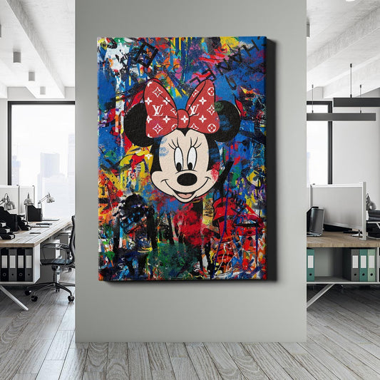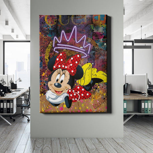 Normaler Preis Von 69,90 €Normaler PreisStückpreis / proVerkaufspreis Von 69,90 €Eine verspielte, doch rebellische Interpretation von Minnie Mouse, die mit ihrer luxuriösen roten Schleife und den goldenen Schuhen in einer bunten, chaotischen Street-Art-Welt schwebt. Die leuchtende Krone über ihrem Kopf symbolisiert Macht und Individualität. Ein modernes Kunstwerk, das Luxus mit Urban Art kombiniert.