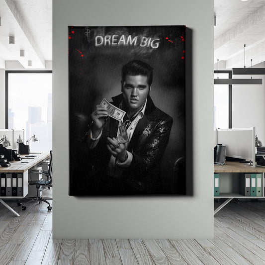 Normaler Preis Von 69,90 €Normaler PreisStückpreis / proVerkaufspreis Von 69,90 €Ein faszinierendes Schwarz-Weiß-Porträt des legendären Elvis Presley, das seine unvergleichliche Ausstrahlung und seinen Erfolg einfängt. Der King des Rock 'n' Roll präsentiert sich in luxuriöser Garderobe, während er Geldscheine in den Händen hält – ein Symbol für seinen kometenhaften Aufstieg und seinen unermüdlichen Traum vom Ruhm. Der rauchige Hintergrund und die leuchtende Botschaft "DREAM BIG" unterstreichen den inspirierenden Charakter dieses Kunstwerks.