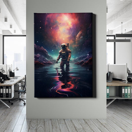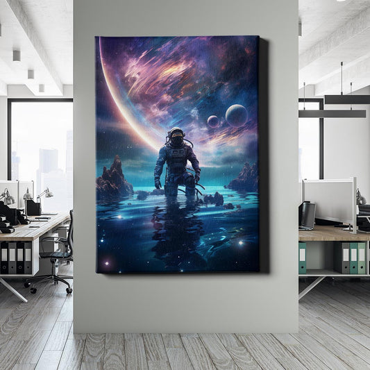 Normaler Preis Von 69,90 €Normaler PreisStückpreis / proVerkaufspreis Von 69,90 €Ein einsamer Astronaut watet durch mysteriöses Wasser auf einem fremden Planeten, umgeben von schwebenden Himmelskörpern und einer atemberaubenden Galaxie. Die Szenerie vermittelt ein Gefühl von Abenteuer, Entdeckung und der unermesslichen Weite des Universums. Ein Kunstwerk, das die Sehnsucht nach dem Unbekannten und die Magie des Kosmos einfängt.
