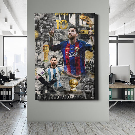Normaler Preis Von 69,90 €Normaler PreisStückpreis / proVerkaufspreis Von 69,90 €Lionel Messi, der Inbegriff des modernen Fußballs, vereint in einem Kunstwerk seine größten Erfolge. Vom FC Barcelona bis zur argentinischen Nationalmannschaft – seine Karriere ist geprägt von Ballon d'Or-Triumphen, Weltmeisterehren und unzähligen magischen Momenten. Ein Denkmal für den vielleicht größten Spieler aller Zeiten.