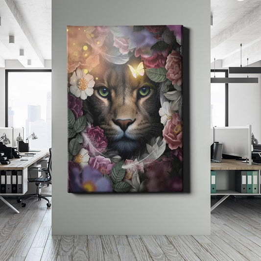 Normaler Preis Von 69,90 €Normaler PreisStückpreis / proVerkaufspreis Von 69,90 €Ein prachtvoller Löwe ruht inmitten einer üppigen, blühenden Dschungellandschaft, umgeben von sanft flatternden Schmetterlingen. Sein durchdringender Blick strahlt Weisheit und Stärke aus, während das goldene Licht der Natur ihn in eine fast mystische Aura hüllt. Dieses Kunstwerk vereint Eleganz und Wildheit in perfekter Harmonie.